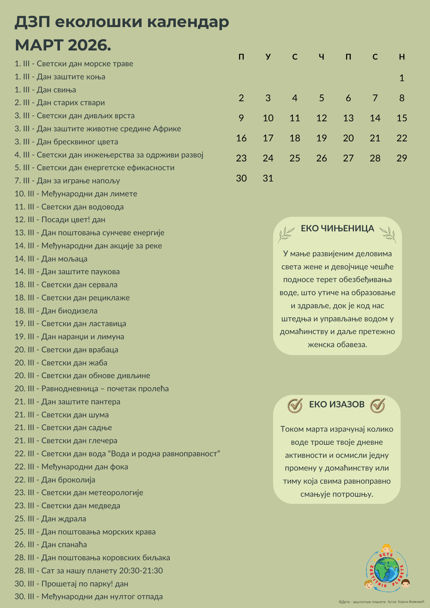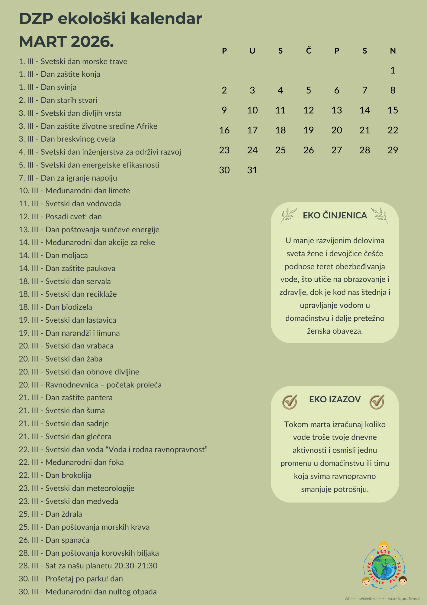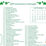 U DZP ekološkom kalendaru obeleženi su svi dani koji se odnose na ekologiju i zaštitu životne sredine, a za koje uspemo da pronađemo relevantne izvore, bilo da su ih ustanovile Ujedinjene nacije ili grupa entuzijasta spremna da pokrene akciju.
